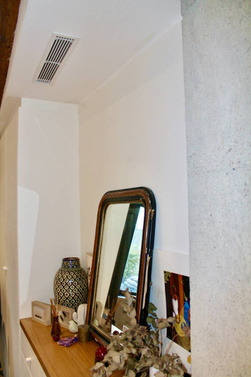 Après l'achat de sa résidence principal à Lyon, Henri a fait appel à nos services pour l'installation d'un système de chauffage et de climatisation pour son appartement. L'enjeu principal de ce projet était de conserver l'aspect esthétique de l'espace. Nous avons donc conseillé à notre client l'installation d'une climatisation réversible Toshiba gainable, permettant de rendre le système de climatisation très discret, tout en gardant des performances de chauffage et de climatisation importantes. En hiver, les températures à Lyon peuvent avoisiner les -10° C. Il est donc primordiale d'avoir une pompe à chaleur air/air performante pour avoir un confort optimal lors des jours d'hiver glacials. Le gainable extra-plat est directement encastré dans le fond plafond. Trois grilles de soufflage ont été installées dont deux dans la pièce de vie et une dans la chambre. Une grille de reprise a été posée dans la pièce de vie au dessus de la bibliothèque.
